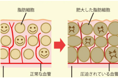 運動不足や食べ過ぎで脂肪細胞がどんどん大きくなって毛細血管が押しつぶされている状態。。